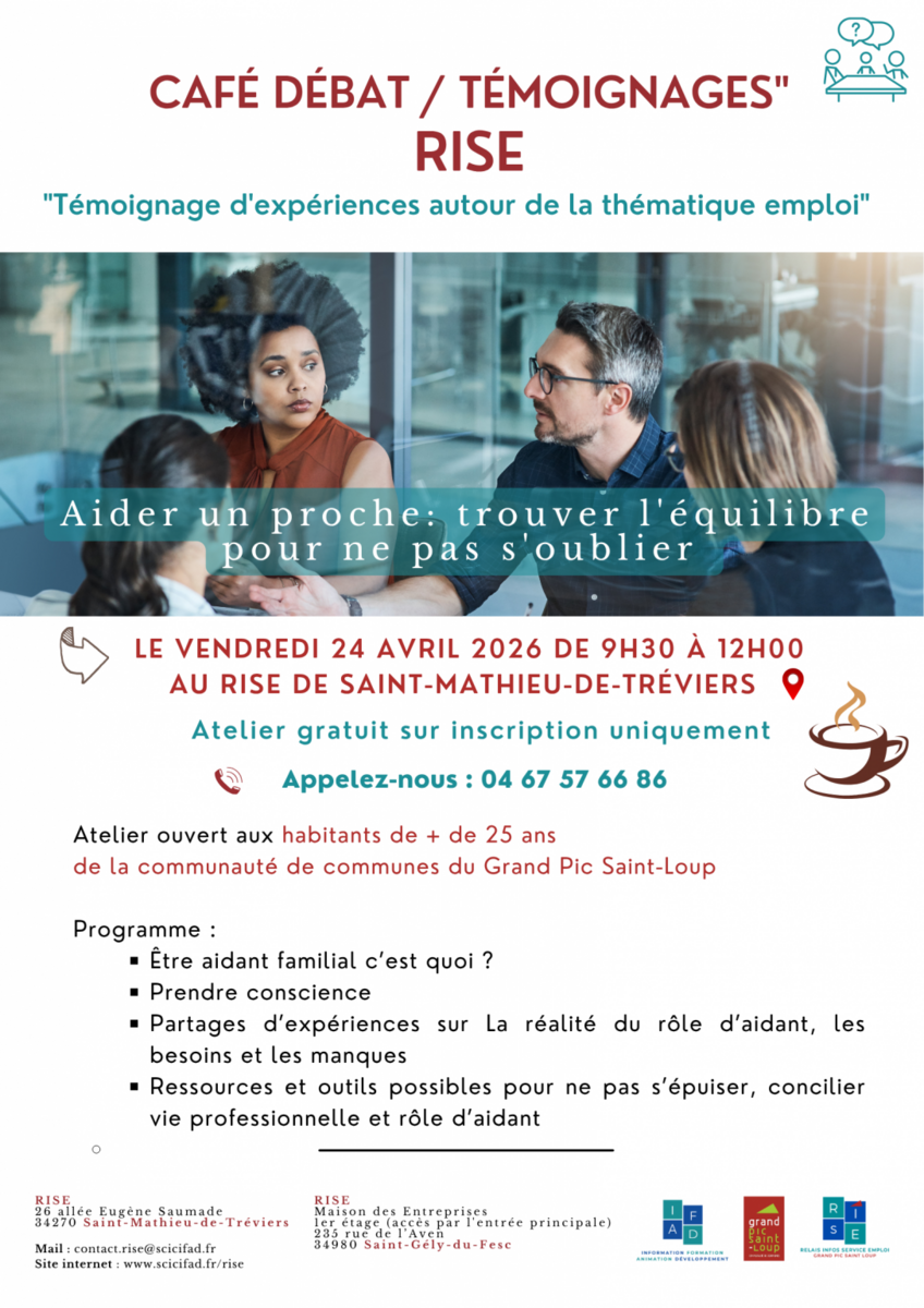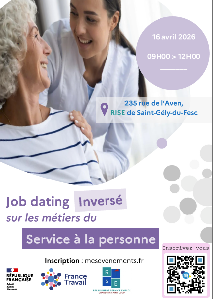 France travail organise en collaboration avec les RISE un Job dating inversé " SERVICE A LA PERSONNE " le Jeudi 16 avril de 9h à 12h. Cette animation se déroulera dans les locaux de l'atelier des projets, au 1er étage du RISE, 350 rue de l'Aven à Saint Gély du Fesc. Les inscriptions sont obligatoires par mail contact.rise@scicifad.fr ou téléphone: 04 67 57 66 86 ou 04 67 06 07 55.